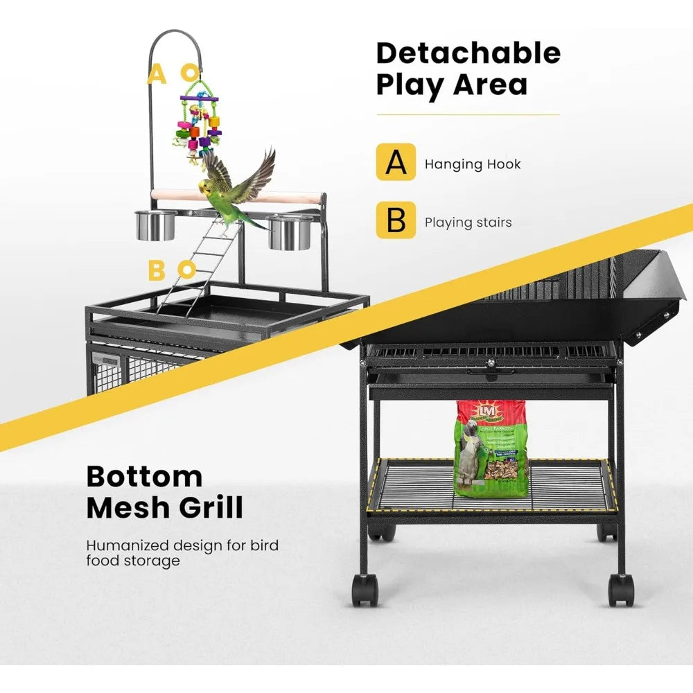 - CONSIDERATE DESIGN - The heavy-duty sliding window latch keeps your bird securely inside its cage and not easy pecked open by bird. Four 360° rotating swivel casters allow for easy mobility and the bottom mesh grille helps you store bird food, toys or bird care products