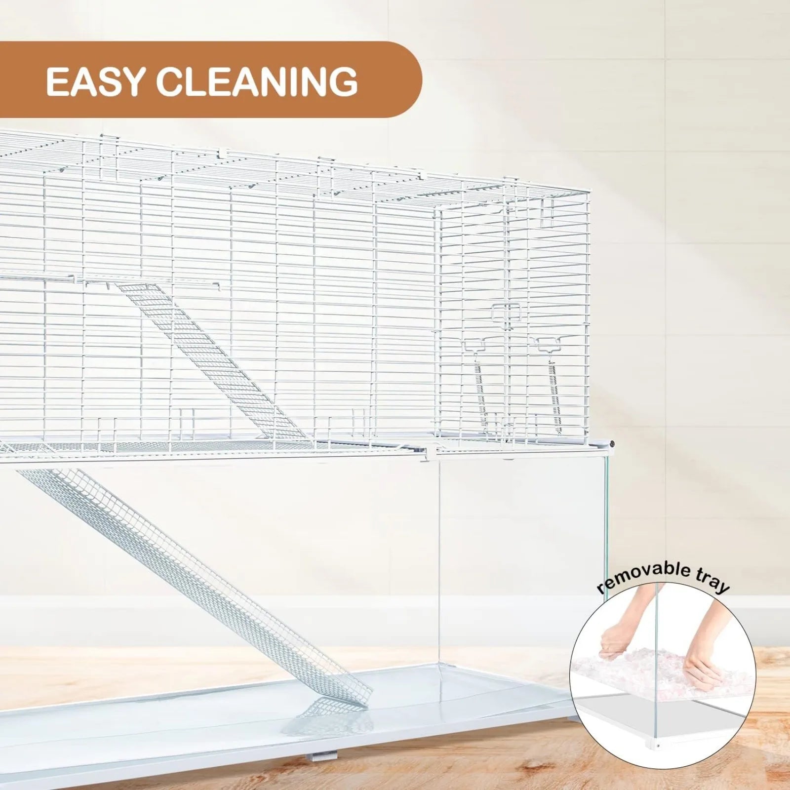 🐹🦔【Easy To Clean】Comes with a transparent waterproof PVC tray at the bottom is convenient to take out for easy cleaning. Cage is water washable, all soiled you can wipe it down with water won't leave any funky smell, offers a healthy living environment for your pet.